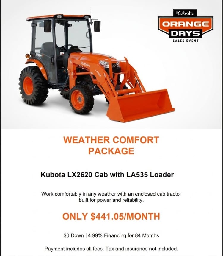 0% APR available or save up to $1,500 on your new Kubota TLB Series!